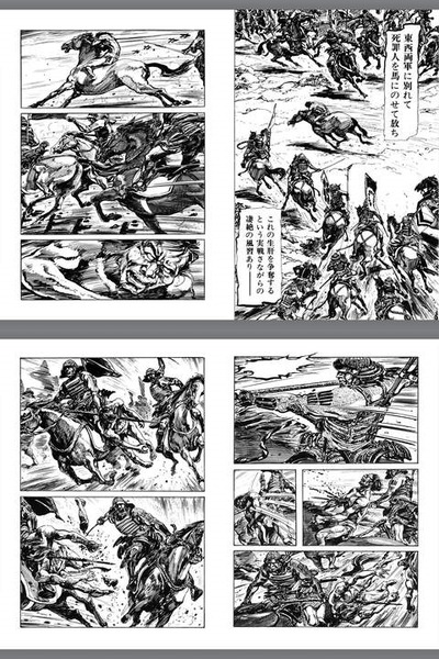 愛馬が主人の意を察したのかのように、鑓を下に向けて突けるよう、愛馬が前膝を折った