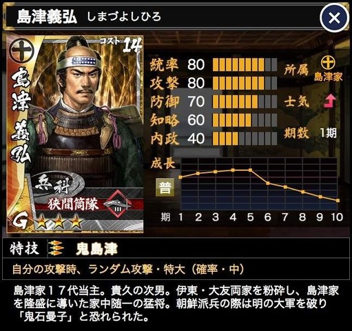島津豊久 統率68 武勇84 知略42 政治28 義理90