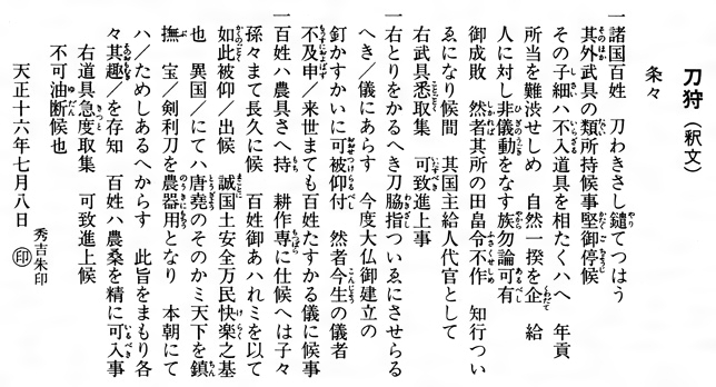 第3条 百姓は農具だけを持って耕作に励めば、子孫代々まで無事に暮せる。百姓を愛するから武器を取り上げるのだ。ありがたく思って耕作に励め。
