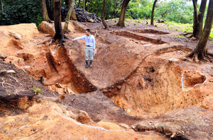 地下室だったとみられる長方形の素掘りの穴(深さ1・9メートル、南北5・7メートル×東西3・8メートル)が出土し、その4隅に柱穴もみつかった。