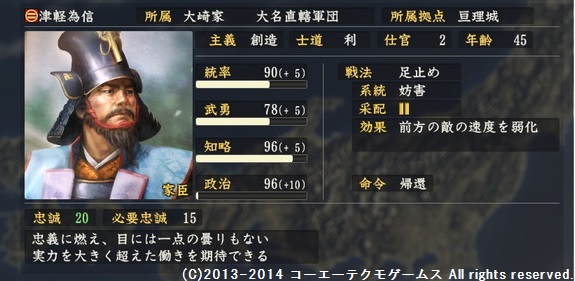 多分、ゲームではメジャーじゃない武将は能力が低く設定されるから、 辺境の地である津軽の武将が能力値を高く設定されている、津軽為信の評価は、かなり良いではないでしょうか!
