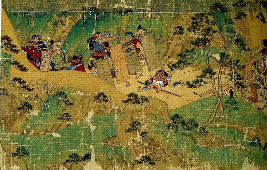 時代にもよるが、合戦絵巻を見ると板盾を前にして両軍が弓矢で撃ち合って落伍者をつくる。